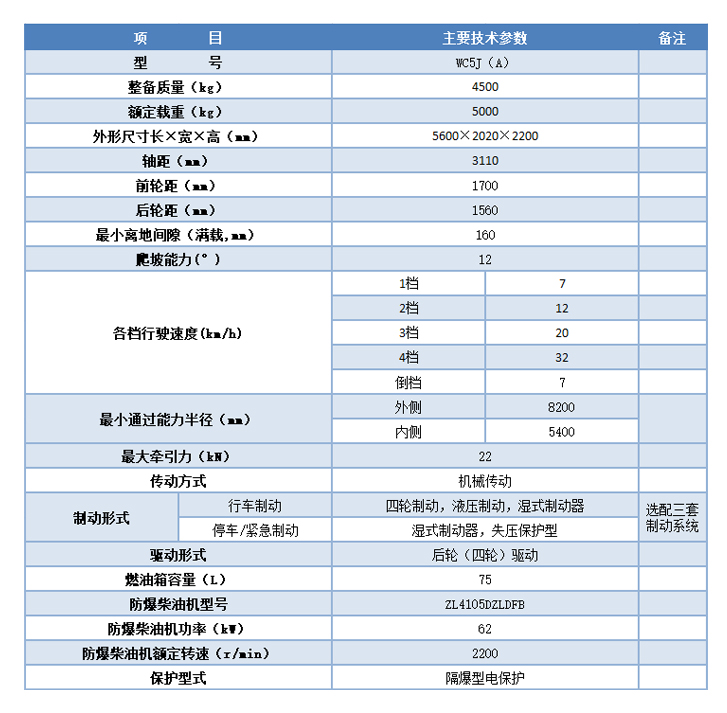 WC5J(A)型防爆柴油機(jī)無軌膠輪車是我公司根據(jù)中小型煤礦井下的運(yùn)輸實(shí)際要求研制開發(fā)的一種新型運(yùn)載工具,是一款以具有國Ⅲ排放標(biāo)準(zhǔn)、增壓中冷、電控高壓共軌噴射型式的ZL4105DZLDFB防爆柴油機(jī)為動力,輸出功率62kW、機(jī)械傳動、濕式制動、后輪(四輪)驅(qū)動的煤礦井下無軌式運(yùn)輸機(jī)械。 失壓保護(hù)型濕式制動系統(tǒng)的應(yīng)用,使工作更加可靠,因系統(tǒng)故障和制動管路發(fā)生任何故障而失壓時,制動器均能自動實(shí)現(xiàn)制動,確保車輛的安全,失壓保護(hù)型濕式制動器可以集行車制動、駐車制動和緊急制動于一身,精簡了結(jié)構(gòu),給車輛總體布局帶來方便。使車輛制動更加安全可靠。 該車動力強(qiáng)勁,性能穩(wěn)定,加裝了先進(jìn)的進(jìn)排氣系統(tǒng)及自動保護(hù)裝置,具有可靠優(yōu)越的防爆性能。具有井下作業(yè)所需的強(qiáng)勁動力和可信賴的安全保障措施。 車架全部采用載重汽車專用優(yōu)質(zhì)碳素結(jié)構(gòu)鋼510L軋制型鋼為原材料,進(jìn)一步保證了整車的強(qiáng)度。提高了整車的使用壽命。