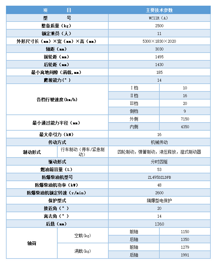 1、WC11R(A)防爆柴油機(jī)無(wú)軌膠輪車(chē)性能描述 WC11R(A)型防爆柴油機(jī)無(wú)軌膠輪車(chē)是一種以ZL495DZLDFB防爆柴油機(jī)為動(dòng)力、重慶五十鈴QL10302DWS型汽車(chē)為底盤(pán)、機(jī)械傳動(dòng)、四輪驅(qū)動(dòng)的礦用無(wú)軌式運(yùn)人、運(yùn)料機(jī)械。配套動(dòng)力具有國(guó)Ⅲ排放標(biāo)準(zhǔn)、增壓中冷、電控高壓共軌噴射型式的ZL495DZLDFB防爆柴油機(jī),輸出功率48kW(防爆后),動(dòng)力強(qiáng)勁,排放性能符合GB20891-2014非道路移動(dòng)機(jī)械用柴油機(jī)排氣污染物排放限值及測(cè)量方法(中國(guó)第三、第四階段)。防爆性能符合MT990-2006礦用防爆柴油機(jī)通用技術(shù)條件。 其結(jié)構(gòu)設(shè)計(jì)合理先進(jìn),具有國(guó)內(nèi)或行業(yè)內(nèi)領(lǐng)先地位。整車(chē)性能優(yōu)越,動(dòng)力強(qiáng)勁、乘坐舒適、節(jié)能環(huán)保,符合煤礦井下易燃易爆氣體連續(xù)存在的場(chǎng)所使用要求。是煤礦井下巷道內(nèi)運(yùn)人、運(yùn)料的理想運(yùn)載工具。運(yùn)行穩(wěn)定、可靠,安全性、經(jīng)濟(jì)性能高,維護(hù)維修率低、故障少、運(yùn)行簡(jiǎn)捷方便。該車(chē)具有如下技術(shù)特點(diǎn): 1)、整車(chē)完美繼承了原車(chē)外形漂亮、內(nèi)飾美觀、操縱性好、乘坐舒適的優(yōu)點(diǎn)。 2)、車(chē)身覆蓋件等全部采用模具沖壓成型,專(zhuān)業(yè)設(shè)備精密焊接,具有良好的隔溫、降噪和密閉性能。設(shè)計(jì)柔性吸能變形區(qū)和剛性安全區(qū),提高安全性能。最大程度保護(hù)駕乘人員安全。 3)、制動(dòng)系統(tǒng)采用濕式制動(dòng)型式,失壓保護(hù)型濕式制動(dòng)系統(tǒng)的應(yīng)用,使工作更加可靠,因系統(tǒng)故障和制動(dòng)管路發(fā)生任何故障而失壓時(shí),制動(dòng)器均能自動(dòng)實(shí)現(xiàn)制動(dòng),確保車(chē)輛的安全,集駐車(chē)制動(dòng)和緊急制動(dòng)于一身,精簡(jiǎn)了結(jié)構(gòu),給車(chē)輛總體布局帶來(lái)方便。使車(chē)輛制動(dòng)更加安全可靠。工作制動(dòng)為濕式制動(dòng)器,緊急制動(dòng)和停車(chē)制動(dòng)為失壓保護(hù)型濕式制動(dòng),使工作更加可靠,因系統(tǒng)故障和制動(dòng)管路發(fā)生任何故障而失壓時(shí),制動(dòng)器均能自動(dòng)實(shí)現(xiàn)制動(dòng),確保車(chē)輛的安全,特別適合于井下運(yùn)輸和爬坡需要。 4)、電氣系統(tǒng)所有電氣件均采用取得安標(biāo)證書(shū)的合格件,自動(dòng)保護(hù)裝置的設(shè)計(jì)更使煤礦井下的不安全因素扼殺在搖籃里,是井下作業(yè)可信賴的安全保障。 5)、采用隔爆兼本質(zhì)安全型電保護(hù)系統(tǒng),對(duì)防爆柴油機(jī)表面溫度、排氣溫度、冷卻液溫度、機(jī)油溫度、機(jī)油壓力、廢氣處理箱液位、瓦斯?jié)舛、柴油機(jī)轉(zhuǎn)速、車(chē)輛速度、燃油箱液位進(jìn)行保護(hù)。 6)、排氣總管、增壓器、波紋管均使用雙層水循環(huán)系統(tǒng)冷卻;柴油機(jī)電控系統(tǒng)為隔爆型,各個(gè)傳感器均為本安型,電磁閥為膠封型,能把柴油機(jī)工作時(shí)易產(chǎn)生火花等潛在的危險(xiǎn)直接扼殺在搖籃里。 7)、該車(chē)為尖頭、箱式,車(chē)身輕巧,具有體積小、結(jié)構(gòu)緊湊、操做方便、轉(zhuǎn)彎半徑小、爬坡能力強(qiáng),油耗低、效率高等優(yōu)點(diǎn)。方便井下會(huì)車(chē)、調(diào)頭,通過(guò)性好。造型設(shè)計(jì)獨(dú)特、強(qiáng)度可靠的前后防護(hù)杠,有效提高車(chē)輛使用安全性。 2 使用環(huán)境條件 1)無(wú)軌膠輪車(chē)能在周?chē)h(huán)境溫度-20℃~+40℃條件下使用。 2)無(wú)軌膠輪車(chē)能在海拔高度不超過(guò)1200m的地區(qū)使用。 3)無(wú)軌膠輪車(chē)能在濕度不超過(guò)95%(+25℃)的環(huán)境中正常使用。 4)無(wú)軌膠輪車(chē)能在爆炸性氣體環(huán)境中正常使用。 5)有無(wú)軌膠輪車(chē)運(yùn)行的礦井下應(yīng)有足夠的通風(fēng)量,其環(huán)境空氣成分應(yīng)符合《煤礦安全規(guī)程》對(duì)井下空氣成分的有關(guān)要求。
